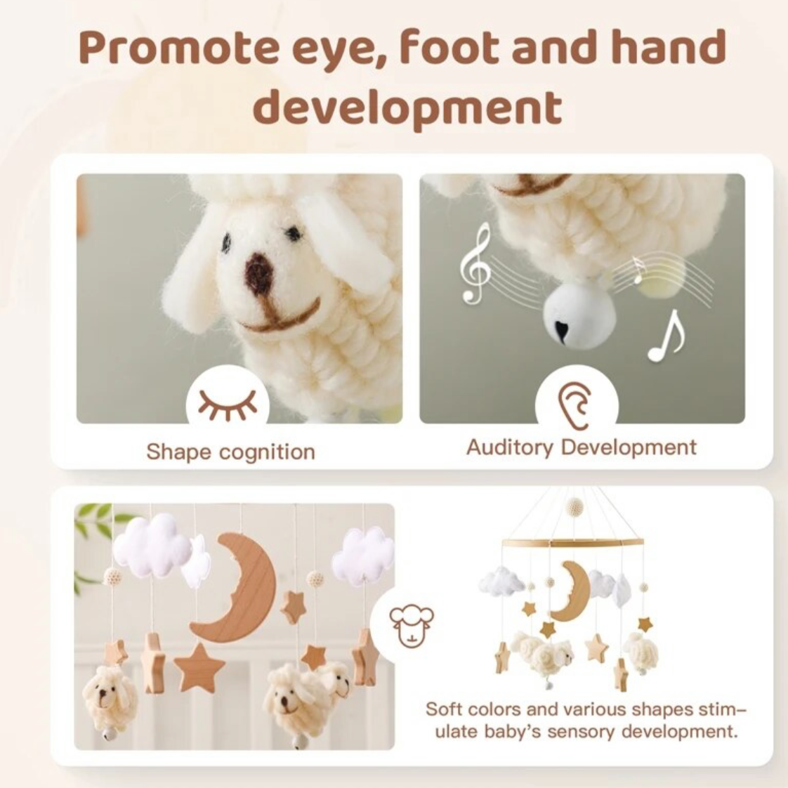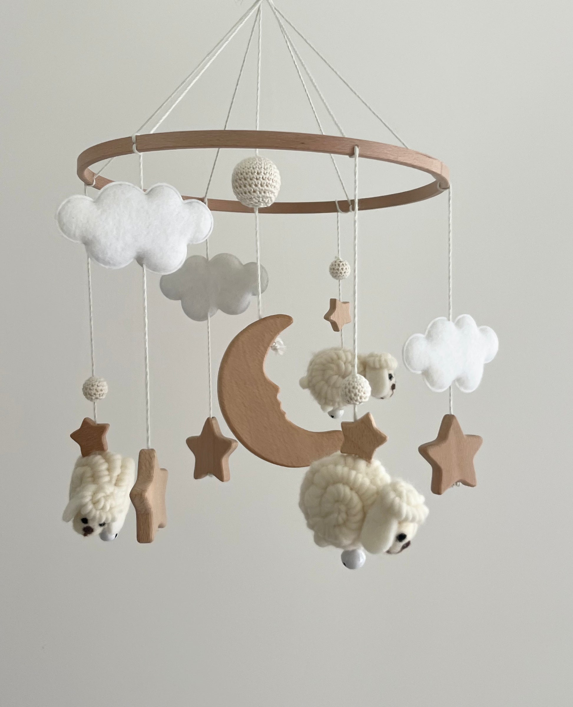 The Sheep mobile comes complete and ready to hang. It features fluffy sheep, stars and clouds surrounding the moon.